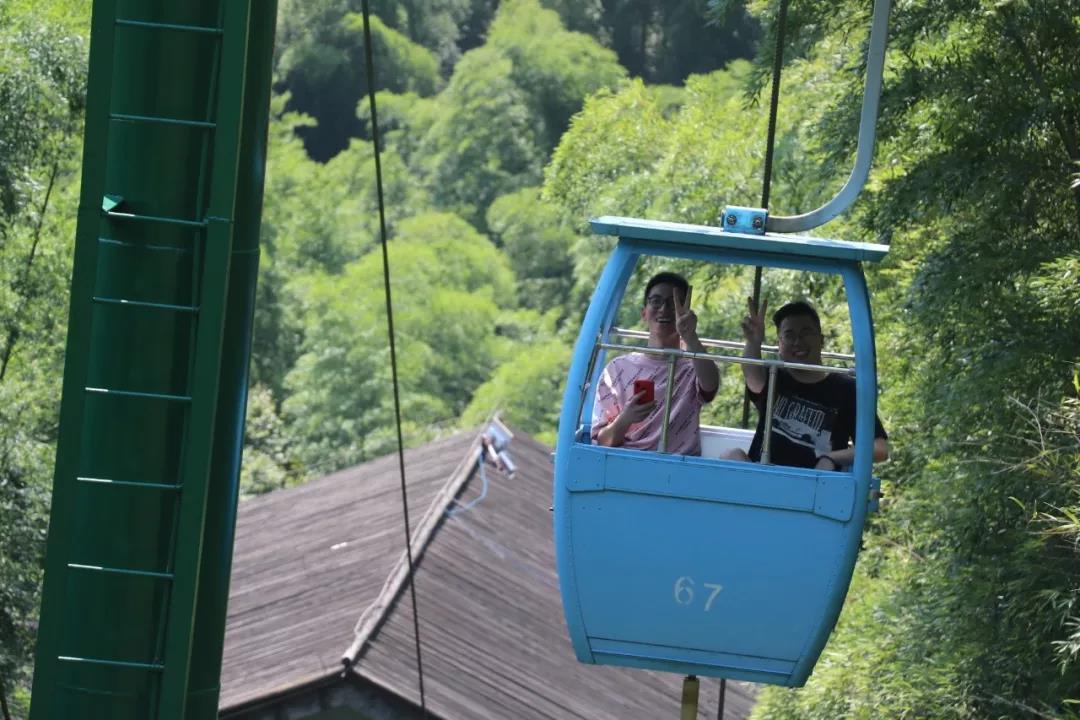 南山竹海一望無際的毛竹倚山抱石,千姿百態(tài),形聲雄渾,情趣別致。上午全體員工乘坐小火車抵達壽星廣場,然后乘坐景區(qū)地面纜車穿梭在竹海中,登頂“吳越‘弟’一峰”。登頂后同事們拾級而下,沿途滿山遍坡長著粗圓挺拔的毛竹,路邊野花盛開,山澗的潺潺溪流和形態(tài)各異的竹木小屋,給全體員工以古樸、原始、自然的意境之感。